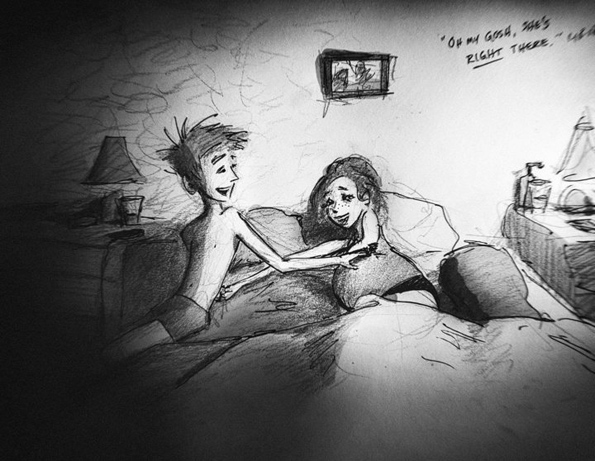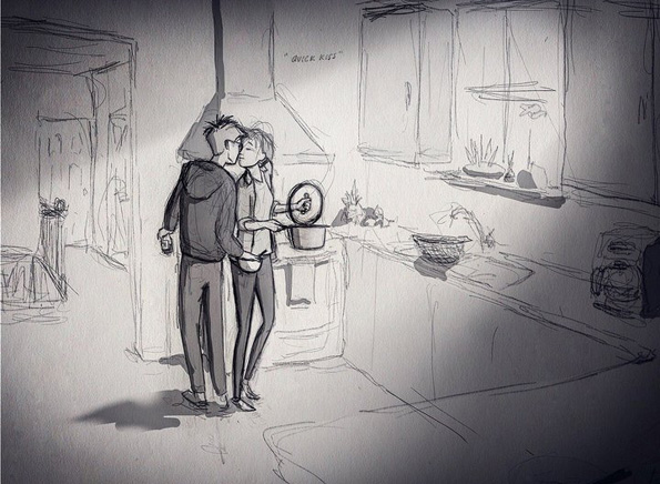 Куртис најчесто ги црта наједноставните моменти, како што е бакнежот наутро или заспивањето навечер.