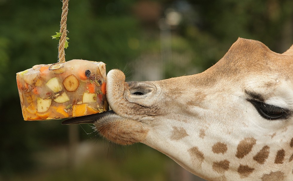 Жирафа елегантно лиже замрзнато парче во лондонската зоолошка