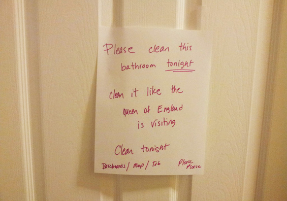 Мајката го замолува синот да ја исчисти бањата, оставајќи му порака запишана на ливче. Тој буквално ја исполнува нејзината задача на многу креативен начин.