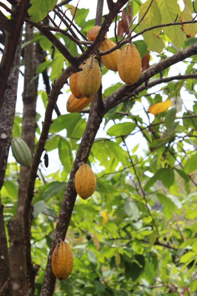 На оваа фотографија се гледаат плодовите какао кои растат од големите гранки на дрвото.
