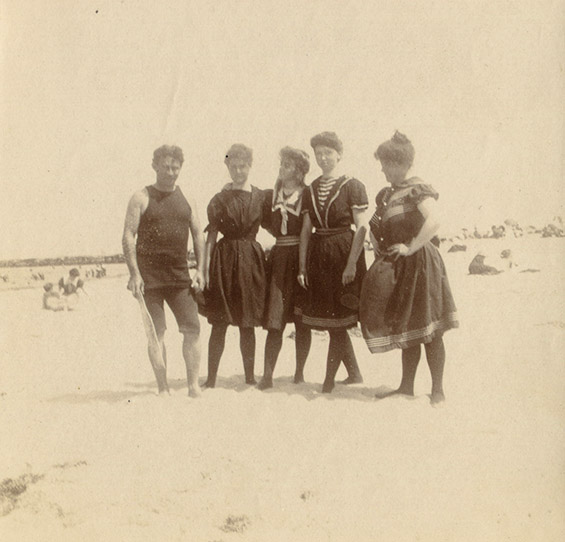 Луѓе во костими за капење на плажата Џетис, Масачусетс, САД, 1900 година