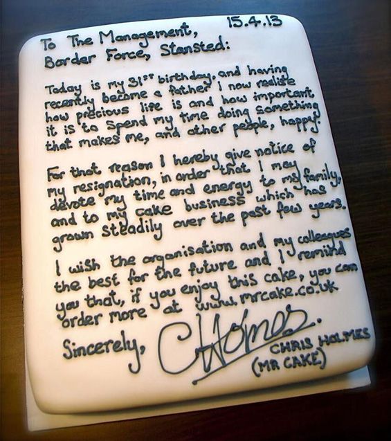 31-годишниот Крис Холмс од Кембриџшир, Англија неодамна направил вкусна торта со порака упатена до менаџментот на фирмата во којашто работел, а сите колеги ги поканил да се засладат од неа.