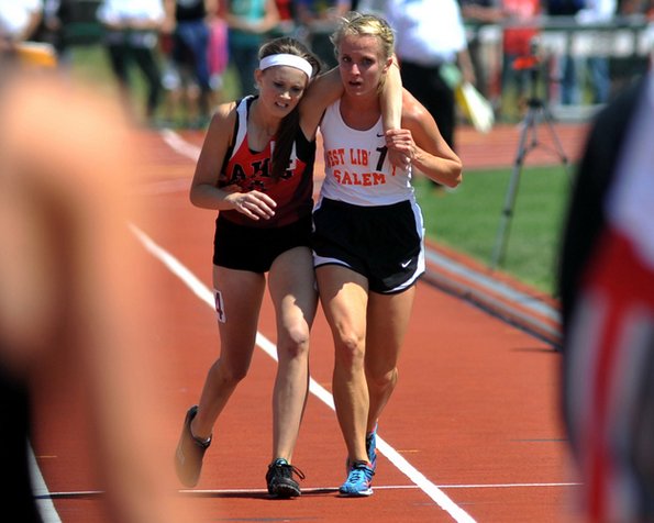 Една од натпреварувачките колабирала за време на трката, а другата натпреварувачка ја носи до целта.
