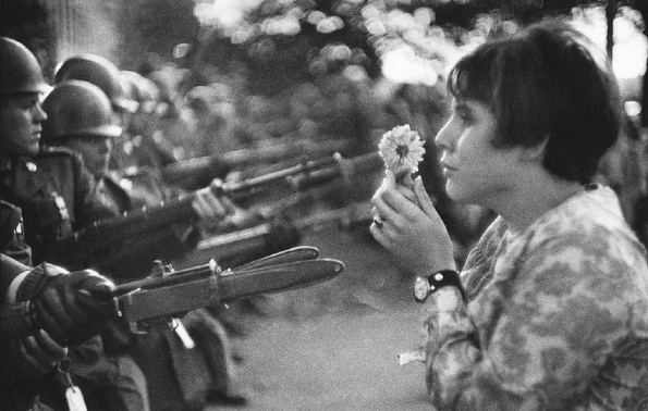 За време на Виетнамската војна, жена држи цвеќе пред војниците.