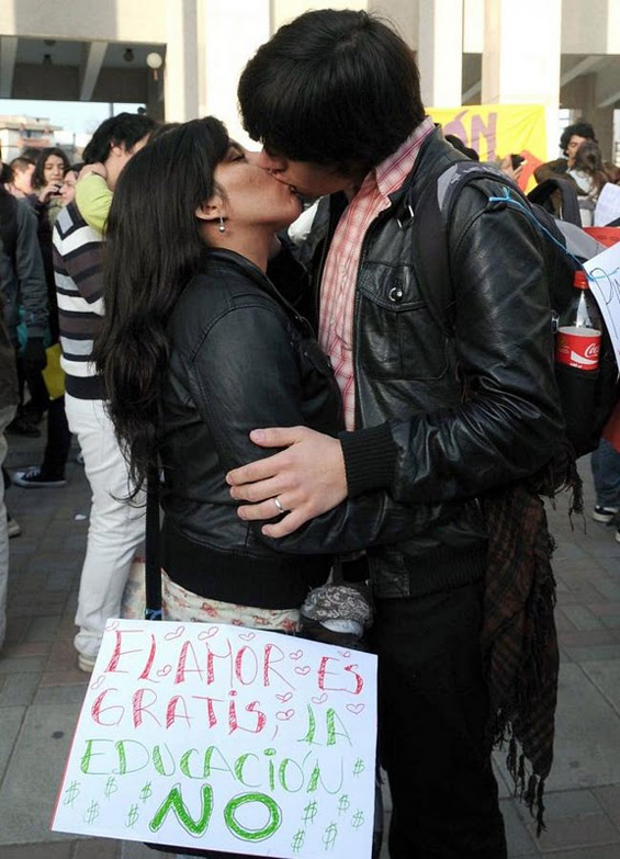 Чилеанските студенти пронашле нов и оригинален начин за протестирање против скапиот и неправеден образовен систем. Наместо да скандираат, да ги маваат факултетите со патлиџани или да прават бељи, тие решиле да спроведат мирни протести со бакнување, кои започнаа на 6 јули и сè уште траат. Со демонстрирање љубов, студентите сметаат дека ќе успеат да го разнежат срцето на чилеанскиот претседател Себастијан Пинера.