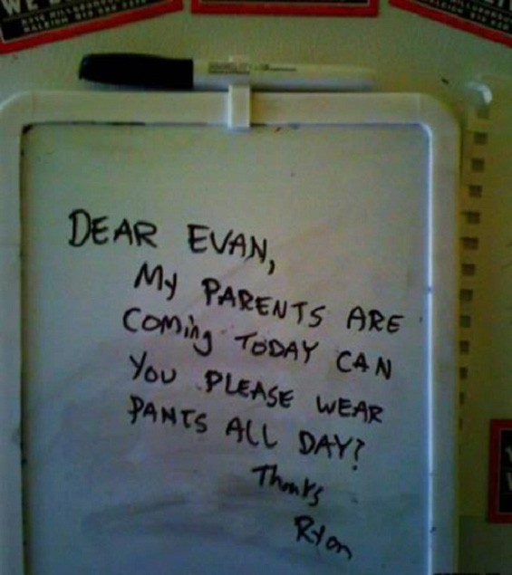Драг Еван, моите родители доаѓаат денес. Ќе можеш ли, те молам, да носиш панталони цел ден? Фала – Рајан