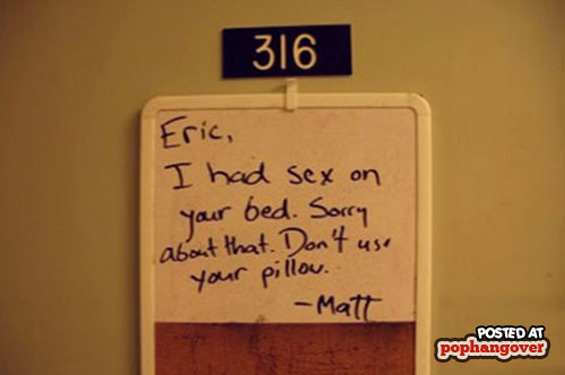 Ерик, имав секс во твојот кревет. Извини за тоа. Не ја користи твојата перница. – Мет