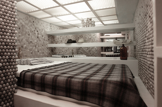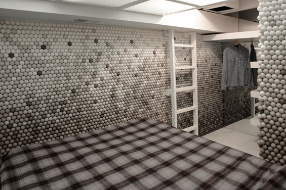 Станчето е всушност поткровје на објектот каде што се сместени канцелариите на Snarkitecture, архитектонската фирма во која Аршам е партнер. За него овој стан овозможува само две функции, а тоа се спиењето и пресоблекувањето. Ѕидовите на апартманот изгледаат како огромен пикселен екран, кој преминува од сиво кон бело, гледајќи од подот кон таванот. Таканаречените пиксели всушност се илјадници пинг-понг топчиња, или попрецизно 25.000.