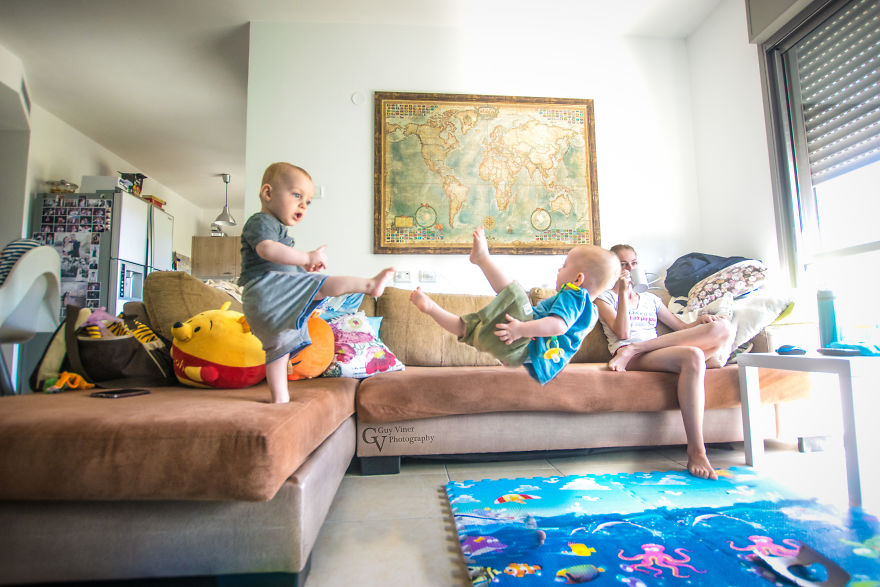 Обично транзицијата се одвива постепено, од ниту едно дете имате едно, па две. Ова ви дава време да се навикнете на хаосот. Но понекогаш луѓето се благословени со близнаци, па од ниту едно дете, веднаш имаат две, или повеќе. Во овој случај можете да почнете да паничите или пак, да се обидете да го извадите најдоброто од ситуацијата и да ги претворите животите на вашите деца во вистинска авантура со невозможни сценарија. Токму ова го направиле еден фотограф и неговата сопруга. Гај Вејнер сакал неговите деца да имаат најдобри фотографии. Проектот започнал со само една фотографија, но сега си има свој живот. Тој е наречен „Помогнете ни! Нашиот татко е фотограф!“ Уживајте во неверојатните фотографии.