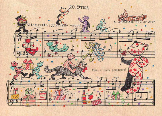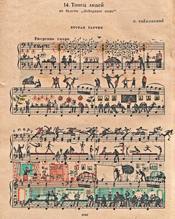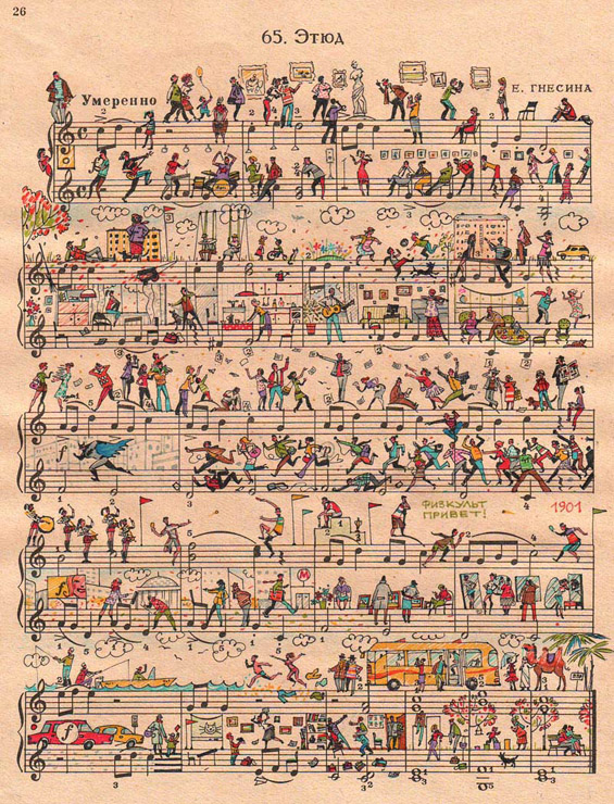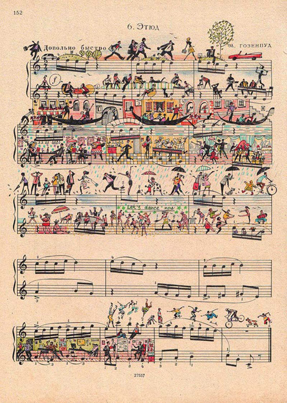 Руското уметничко дуо Алексеј и Лена, познато по своите неверојатни вештини со хартија, повторно изненади со еден необичен проект. Инспирирани од секојдневието, тие направиле фантастични илустрации врз партитури. На старите листови хартија им дале живот и енергија. Главни теми во нивните илустрации се забавата, танцувањето, работата… Толку многу зрачат со живот, што ќе ве натераат да побарате клавир и да отсвирите нешто од нив. 🙂