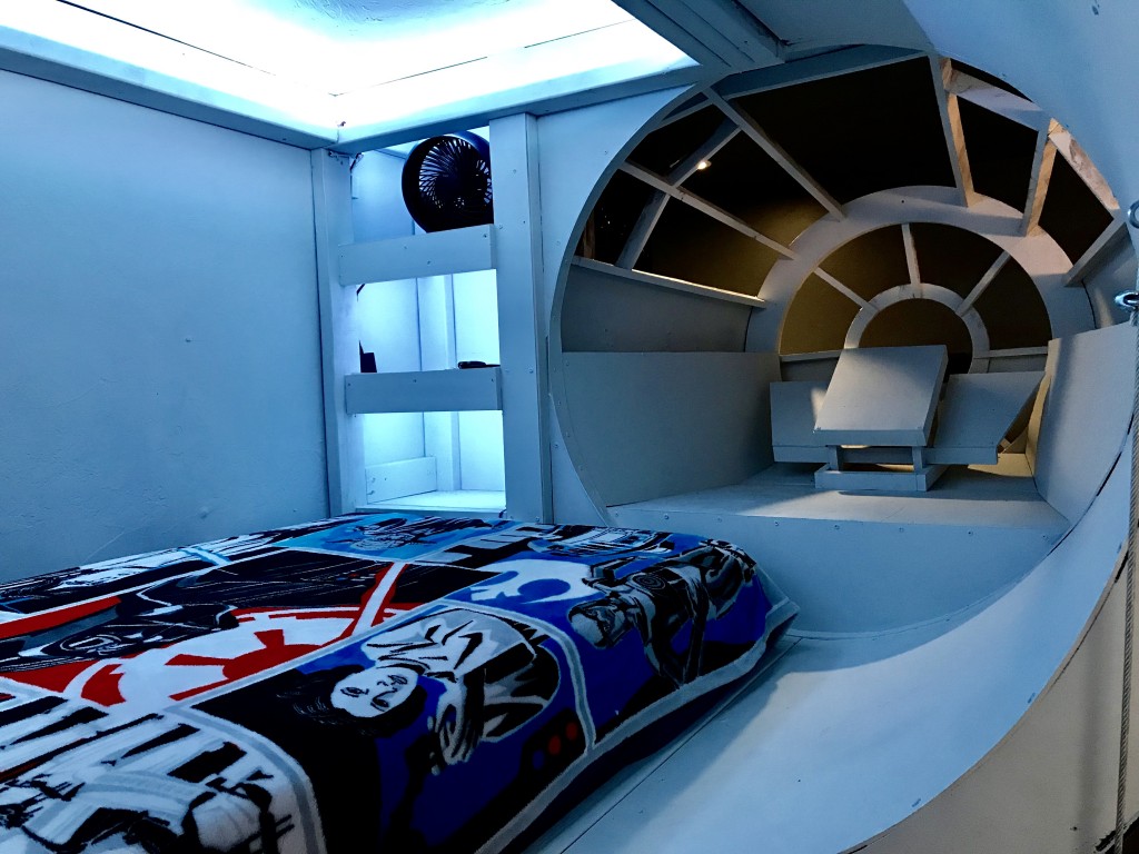 Корисникот на Редит, познат како Dericrw, заедно со неговата сопруга направиле соба со тема од Војна на ѕвездите за нивниот син, со надеж дека ќе го натераат да спие во посебна соба. Кој би можел да одолее на ова? „Каупслата“ за спиење од Милениум Фалкон е голема колку брачен кревет и е закачена на таванот.