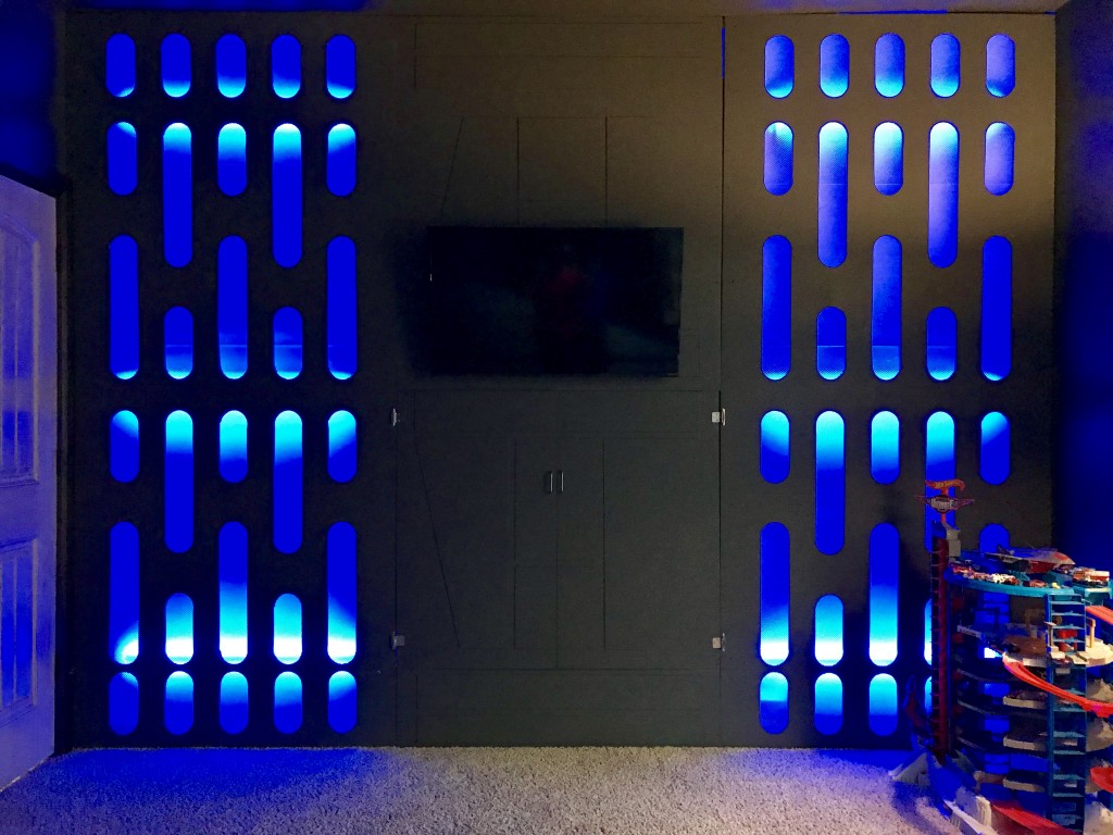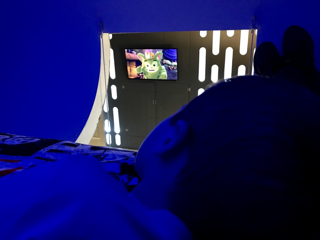 На спротивниот ѕид од креветот има телевизор. Под екранот се наоѓа кутија за „оружја“, каде што стојат играчките. ЛЕД светилките светат во разни бои.