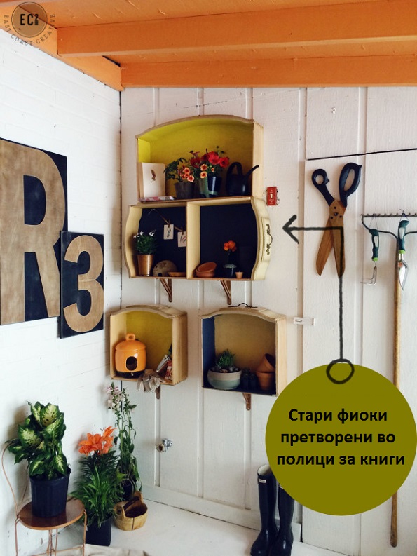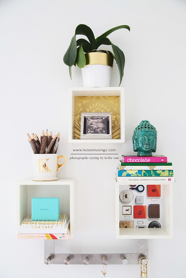 1. На горниот дел од ѕидот поставете коцки за складирање и наредете мали книги