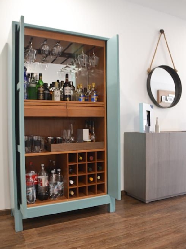 Прво, почнете со полиците за вино или со вдлабнатините за шишиња. Покрај шишињата, можете да ставите и чаши за вино во нив, како и сите дополнителни додатоци што ви се потребни за да ги отворите и да ги сервирате омилените пијалаци.