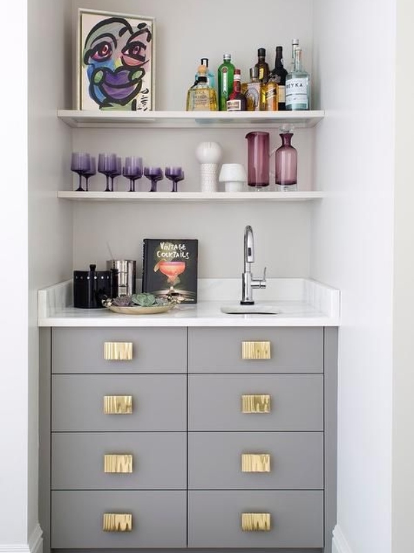 Друга варијанта се вградените минибарови. Ако имате неискористен простор во трпезаријата, во кујната или под скалите во ходникот, можете да го претворите во минибар. Неколку фиоки, полица и две врати е сè што ви треба. Работната површина над минибарот може да се остане слободна и на неа да поставите сирења, маслинки или свежо сечкан цитрус за коктели.