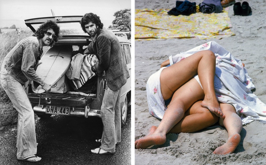 Сурфери во Австралија (лево) и прегрнат пар во Бруклин (десно), 1974