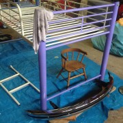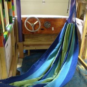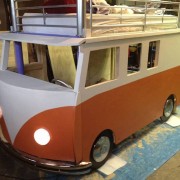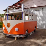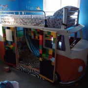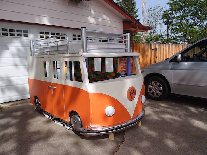 Тој наместо да го изгради креветот од почеток, одлучил дека е подобро да искористи веќе употребуван кревет на спрат и околу него да ги нареди металните делови од автобусот. Таткото покрај деловите од автобусот, употребил и иверица, боја и други материјали со чија помош изградил неверојатен модел од 2-та серија на Фолксваген автобусите, со кревет на кровот, колоритен ентериер, светла кои работат и волан со звучни ефекти. Погледнете…