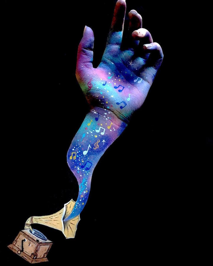 Лиша Симсон е артистка во подем која веќе година дена работи како сликар на тело и лице. За нејзиниот нов проект, таа одлучила да ги искористи своите раце како платно за сликање за да направи надреални оптички илузии. Во некои од дизајните, Лиша внимателно ги пропорционира илустрациите да изгледаат како да излегуваат од нејзината дланка, терајќи ги гледачите да помислат дека држи вистински 3Д објекти – од минијатурни книги до хартиени фигури.