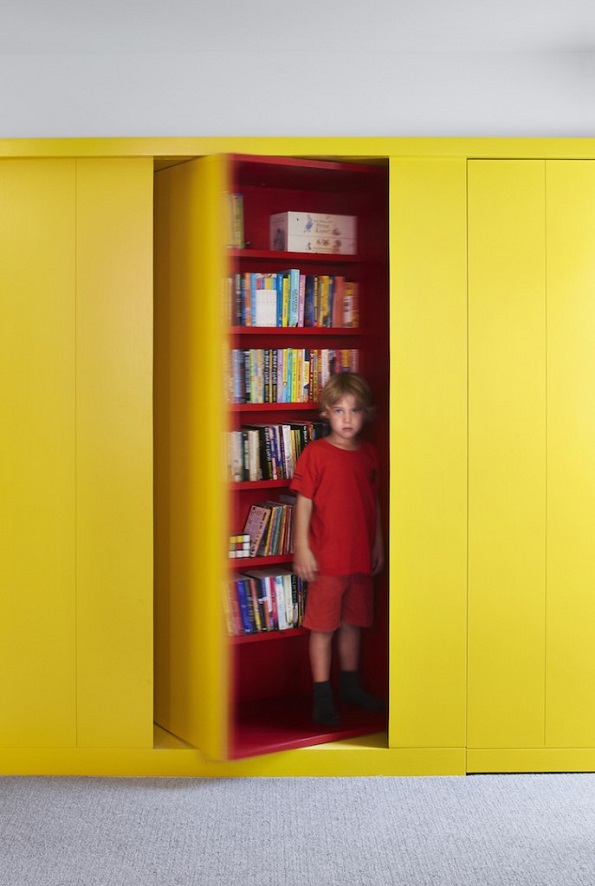 Овие полици освен што служат за редење книги, имаат и своја забавна страна: Малата библиотека која е на ниво на земјата се врти, па води во детската соба на горниот кат. Овие интересни полици биле дизајнирани од архитектот Мет Вајт за неговото семејство.