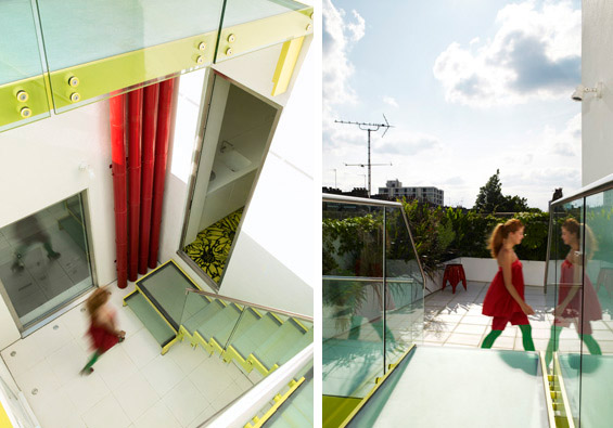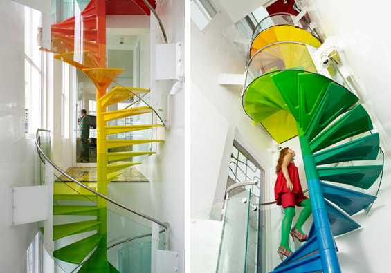 Различните делови од куќата се обединуваат преку едно спирално скалиште во центарот. Оваа конструкција од плексиглас и челик градира низ целиот спектар од виножитото како што се издигнува нагоре кон куќата. На секој кат одредени бои се распределуваат низ просторот, влијаејќи на боите на подот кои создаваат визуелен ритам по вертикални оски. Сонцето се пробива низ стаклениот кров на врвот од куќата осветлувајќи ги скалите и давајќи им живот.