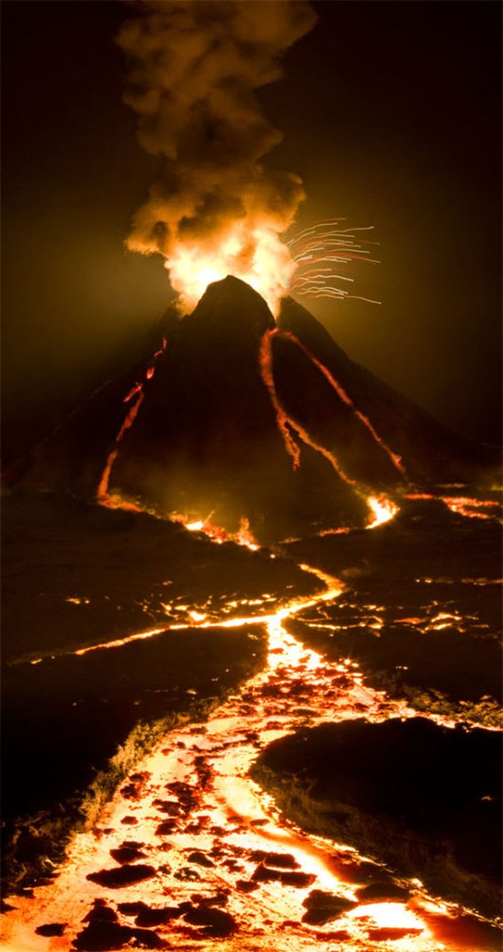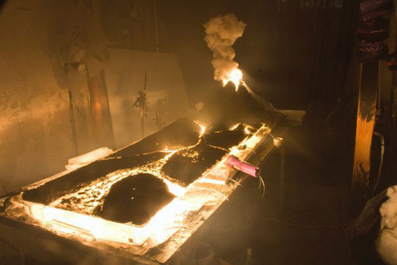 Вулкан – Смесата од талог за тули, памук и фосфорно мастило е осветлена од сијалици со моќност од 6 до 60 вати.