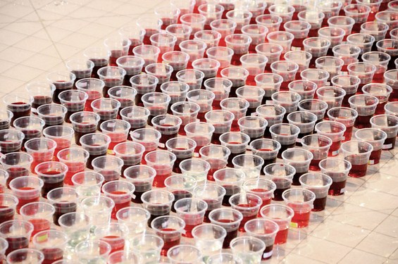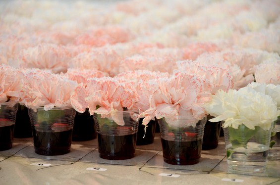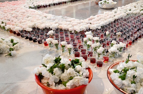 Направено од 2.000 каранфили уредени во пластични чашки со различно количество вода и црвена прехранбена боја за да создаде различни нијанси на црвено, 20 часа подготовка и околу 40 часа за цвеќињата сосема да ја впијат бојата, уметничкото дело на Ред, овозможило повторно да блесне насмевката на Аунг Сан Су Кји, низ цветните обоени ливчиња.