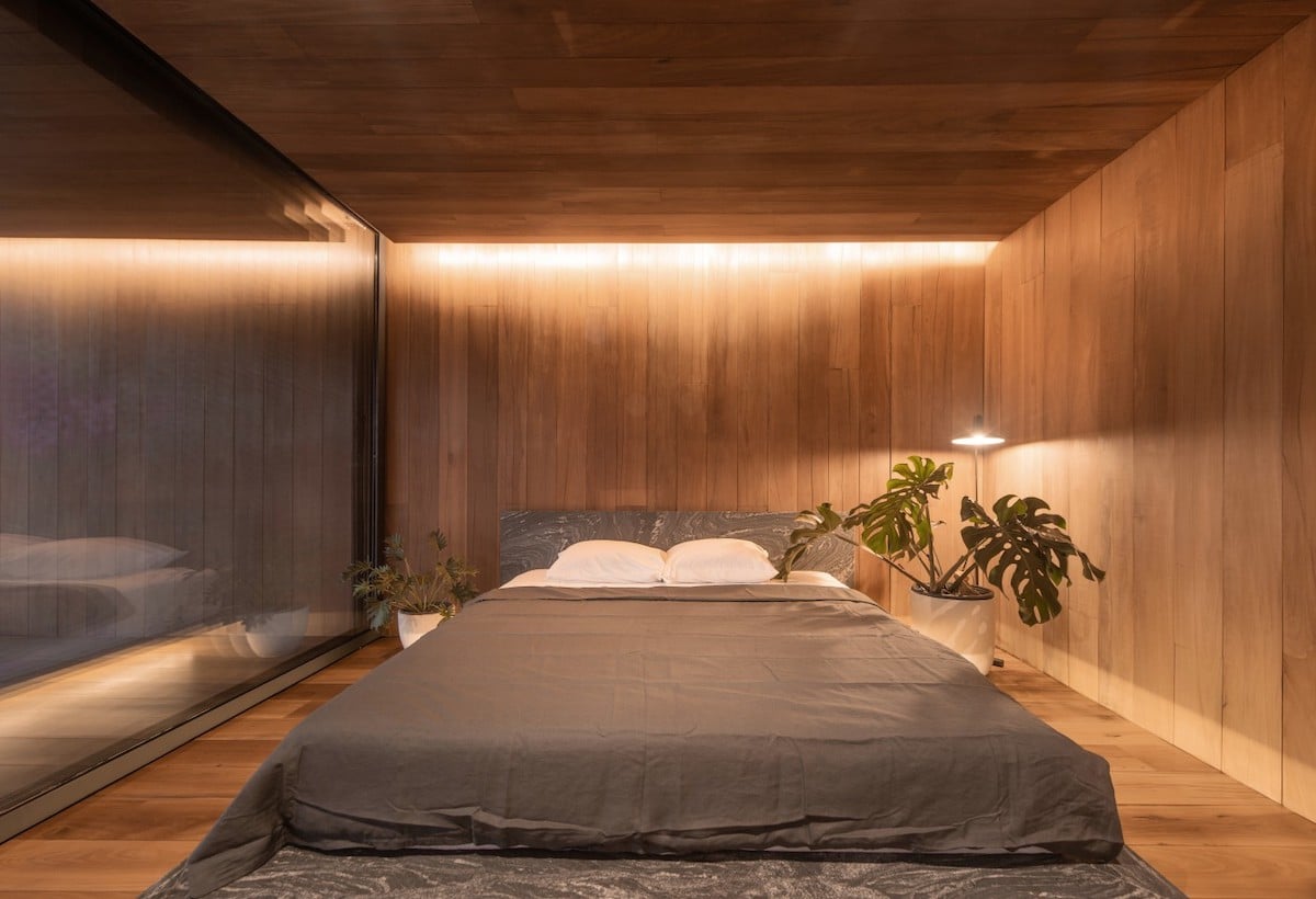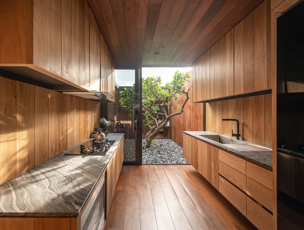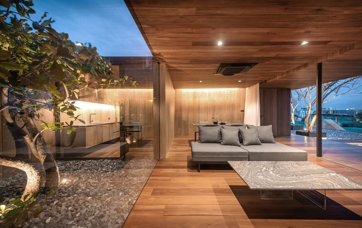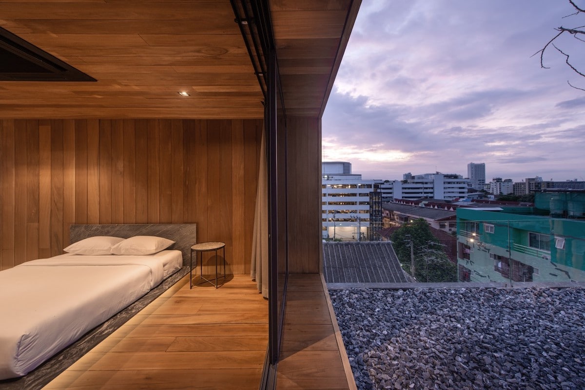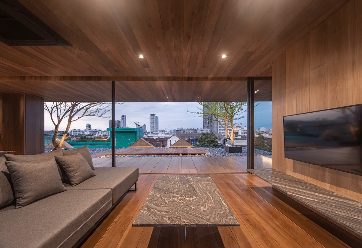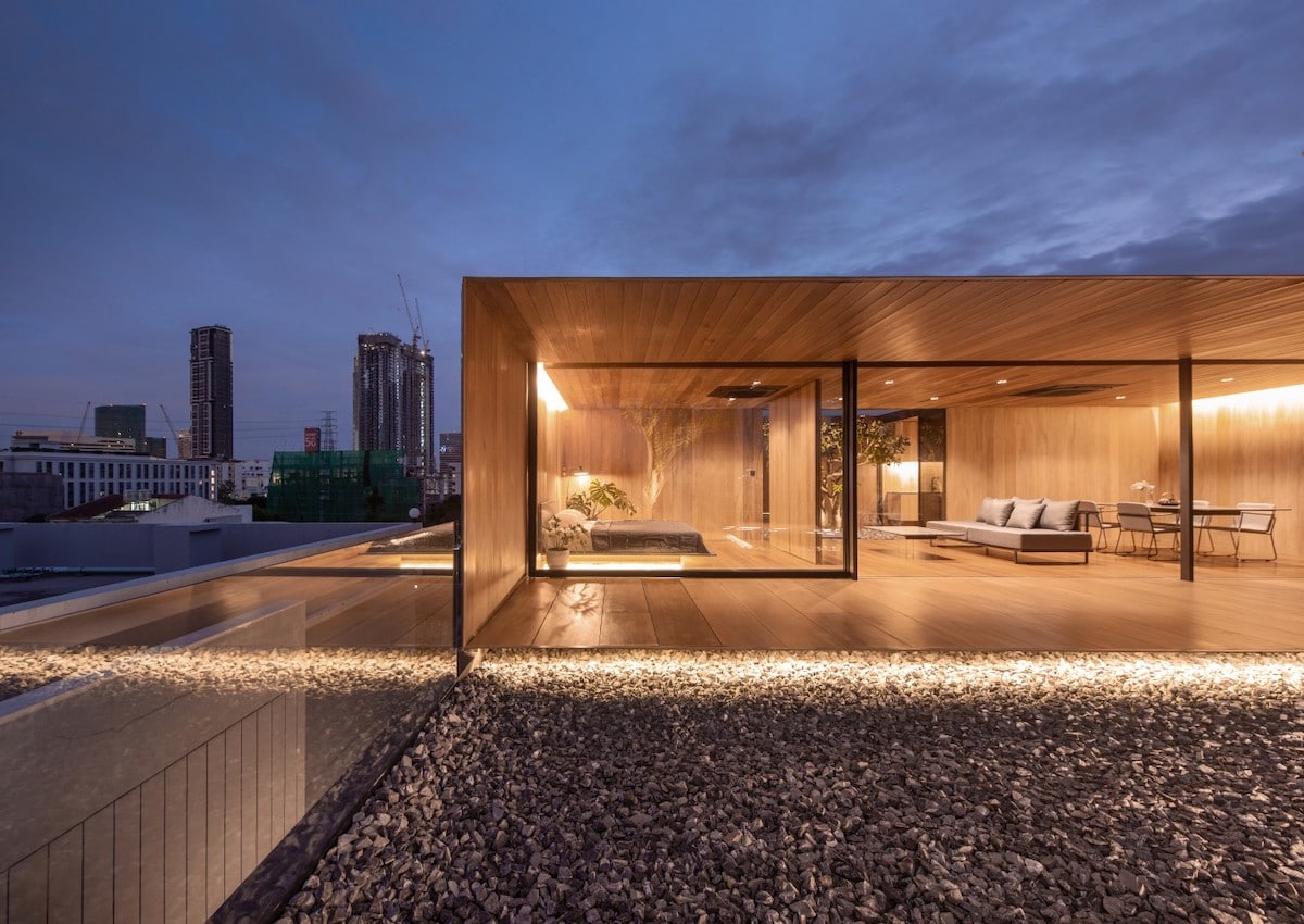Дневната, купатилото, кујната и собата се поврзани со надворешната средина благодарение на широкиот поглед кон дистриктот Лат Прао во Бангкок. Огромната панорама е во контраст со топлината на ентериерот.