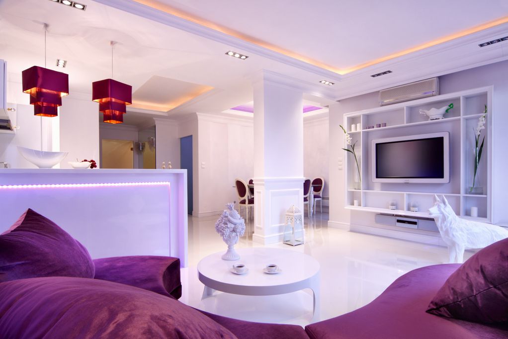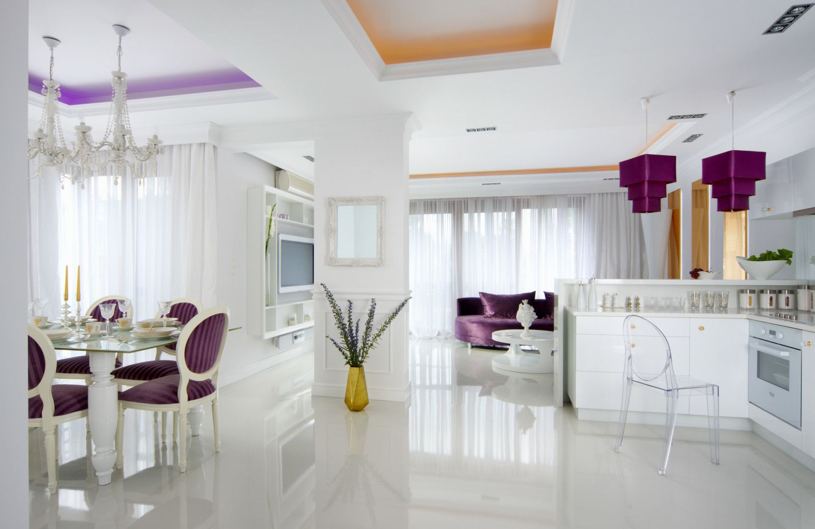 Исто така, се покажа како совршен избор за украсување на луксузен стан кој освојува со својот простран план за отворен простор. Многу белина го прави просторот уште поголем, и сè е подигнато со изобилство на виолетова со златни акценти.