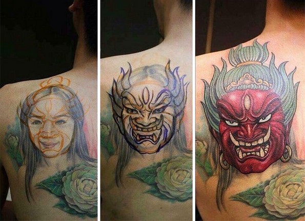 Воглавно, новиот дизајн е поголем од старата тетоважа со цел да има подобра покриеност. Тату артистот може да предложи и неколку третмани со ласерско отстранување. Причината е да се осветли старата тетоважа, со што ќе се покрие полесно. Во продолжение погледнете неколку одлично изведени покривања на тетоважи.