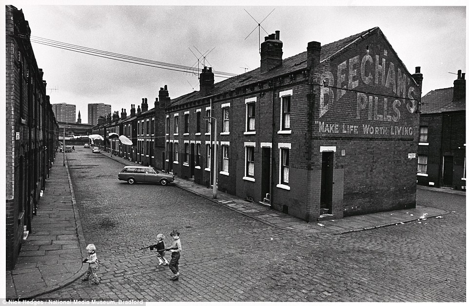 Деца играат со пушки. Јасно е видлива големата реклама испишана на ѕидот на зградата.