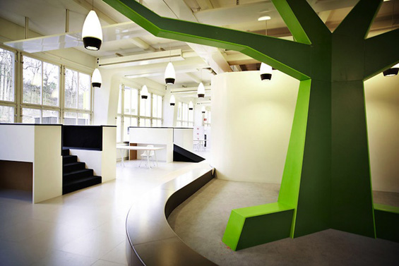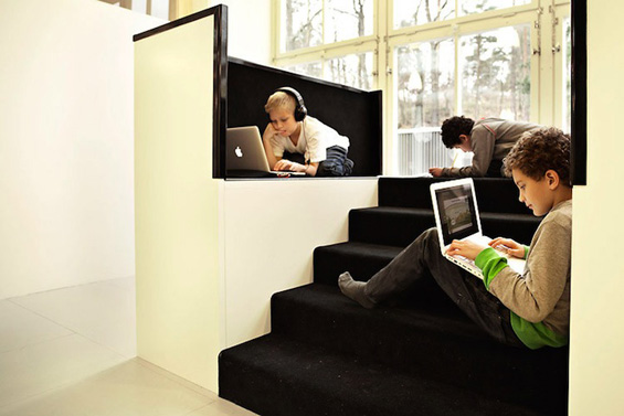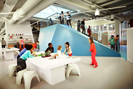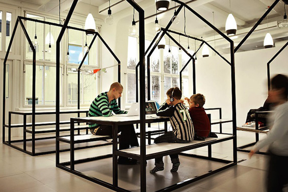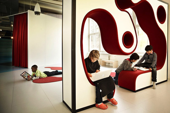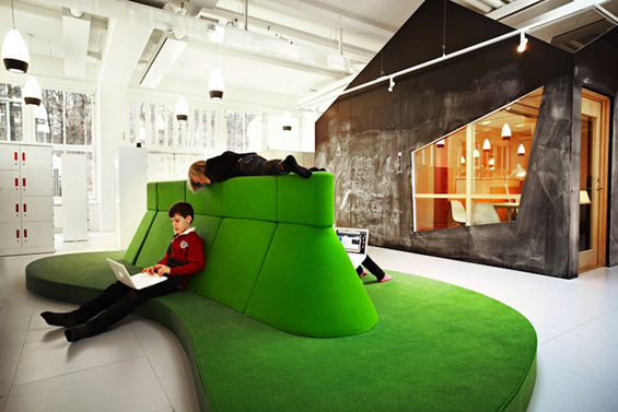 Наместо тоа, учениците се оптегаат на зелените островски седалишта, учат на артистички дизајнирани клупи или се собираат во огромниот син амфитеатар, во кој има огромна санта мраз на сред просторија. Секоја уникатно дизајнирана просторија била промислено создадена на начин кој ќе ги поддржува целите на училиштето за поинаков начин на учење.