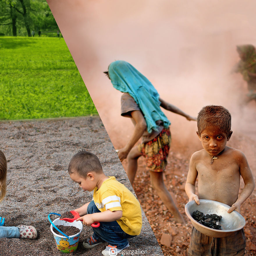 Уур Галенкуш е дигитален уметник од Истанбул кој создава потресни колажи преку кои го прикажува контрастот помеѓу двата света во кои моментално живееме. Уметникот има за цел да го прикаже целиот спектар на проблеми што влијаат врз денешните деца, вклучувајќи ја сиромаштијата, гладот и трговијата со деца.