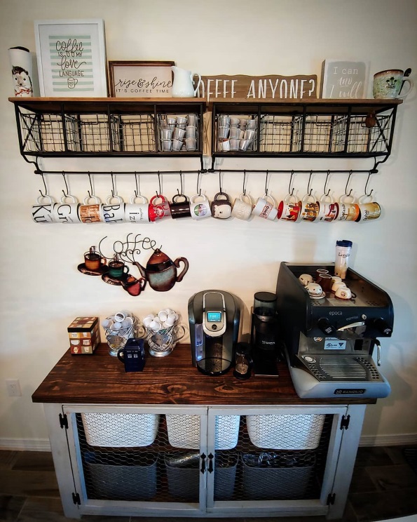 Секојдневно пиете кафе во удобноста на вашиот дом или можеби посетувате локални кафулиња за целокупно доживување на атмосферата? Лошата вест е што некогаш посетувањето на кафулиња може да биде скапо и да чини малку повеќе од вашиот буџет кој го имате на располагање. Добрата вест е што можете да си направите кафе бар во домашни услови! Така нема да го надминете буџетот, но и целосно ќе уживате во ритуалот на пиење на вашиот омилен кофеински пијалак. Ви претставуваме домашно изработени кафе барови со помош на полици, кујни креденци и кутии од кои можете да се инспирирате и да си направите сопствено катче за пиење кафе. Погледнете ги овие уникатни изработки и добијте идеја за уредување на вашиот простор!