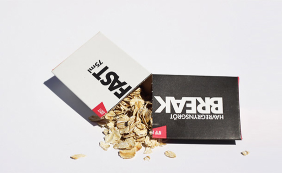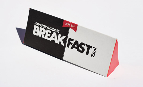 Пакување кое овозможува брзо истурање на овесните снегулки во чинија. Во него има доволна количина на овесни снегулки, шеќер и малку сол. Идејата на слоганот „BREAK FAST“ е да има двојно значење и да ја претставува брзата подготовка на оброкот, а преку спојување на двата збора да се добие зборот „појадок“ на англиски.