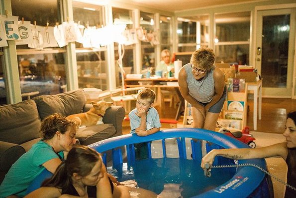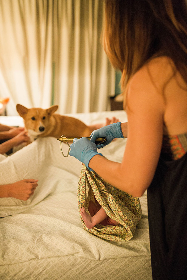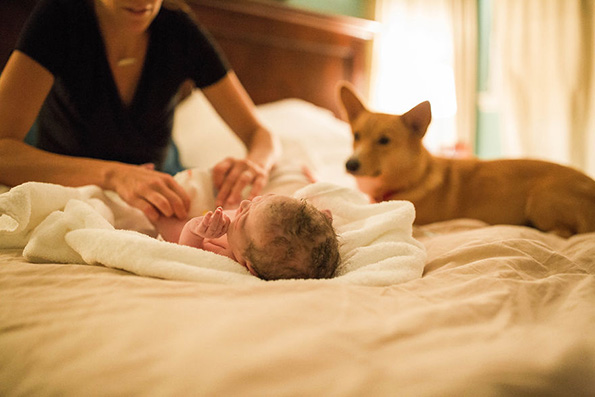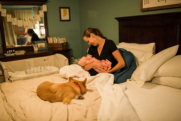 „Тој лежеше на креветот и ја гледаше како се лулка напред-назд. Тој беше смирувачко присуство кога моќта и интензитетот на нејзините контракции се зголемуваше. Одвреме-навреме ќе скокне на креветот и ќе ѝ даде грижлив бакнеж за да ја увери дека може да го преживее ова. Тоа беше прекрасно за гледање“, вели Кристин Вагнер, фотографката. „Кога се префрливме кај базенот за породување, нештата се забрзаа. Рејнџер седеше на каучот и гледаше во неа, погрижувајќи се сè да биде во ред. Во моментите на болка, тој се стрчуваше и ја бакнуваше, а потоа се враќаше на својот кауч, внимателно очекувајќи го доаѓањето на бебето. А кога Беркли конечно пристигна, тој скокна и се стрча за да ја запозна својата мала сестра.“
