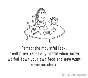 Усоврши го тажниот израз на лицето. Ќе ти биде од исклучителна важност кога ќе ја изедеш твојата храна, па сега сакаш и од туѓата.