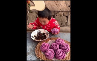 Момчето е облечено во традиционална кинеска носија и совршено прави неколку прилично сложени деликатеси.