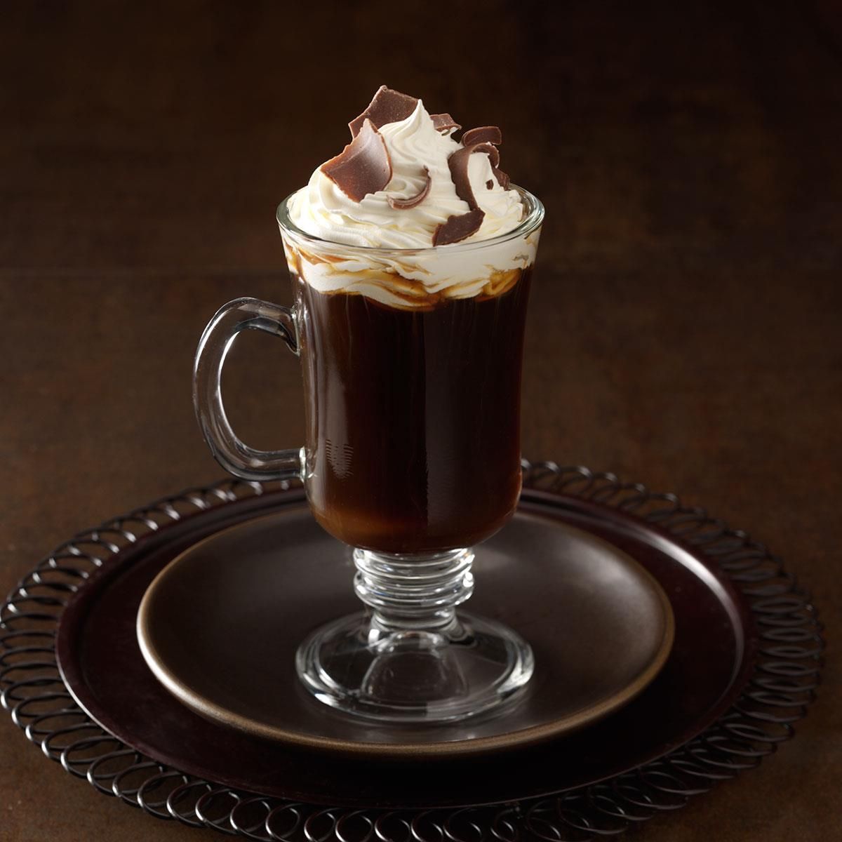 Поделете ги ликерот и шеќерот во 4 шолји, а потоа додајте го и кафето. Земете го омиленото чоколадо и од него, со помош на нож за мачкање, полека излупете тенки „спирали“. Декорирајте со шлаг пената и врз неа поставете ги чоколадните спирали. Послужете веднаш.