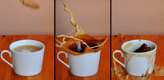 Сигурно досега ви се случило во кафето, чајот или млекото кои ги пиете, случајно да ви падне колаче, коцка шеќер или резанка лимон. Ако тој момент не ви значел ништо тогаш, еве што може да значи ако успеете да го замрзнете времето во вистинската секунда. Уживајте во магијата на фотоапаратот, моментите и секако, вашето утринско кафе.