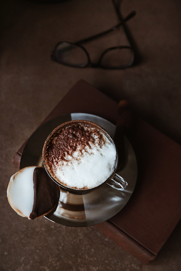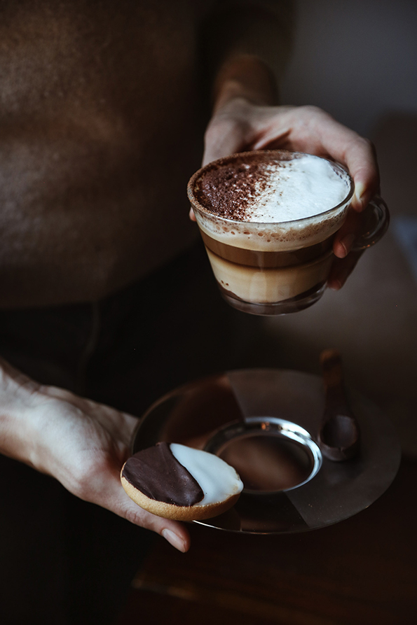 Ставете ја капсулата во кафематот и подгответе го еспресото на вообичаениот начин, но во шолјата со чоколадната смеса. За крај, просејте какао во прав само од едната страна, за да добиете црно-бела комбинација и послужете со колачињата од страна. Измешајте добро пред да пиете.