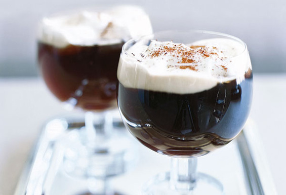 Во широка стаклена чаша ставете ги кафето и правот за топло чоколадо. Посипете со топлата вода и додадете го ликерот од ирски крем. Декорирајте со шлаг и малку цимет.