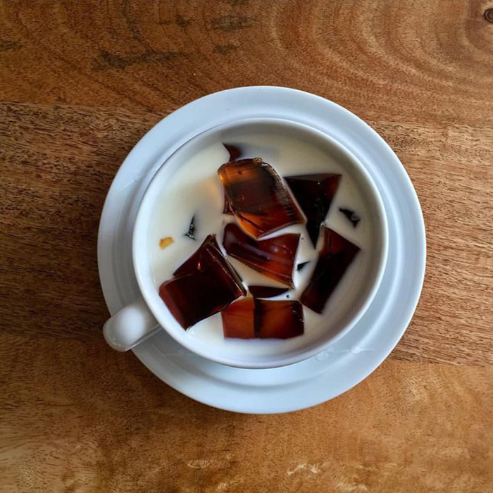 Потопете го желатинот во вода на околу 5 минути. Потоа ставете го жешкото кафе и почекајте целосно да се растопи додека го мешате. Добиената мешавина сипете ја во калапи за ледени коцки и ставете ја во фрижидер за да се зацврсти. Сервирајте со млеко.