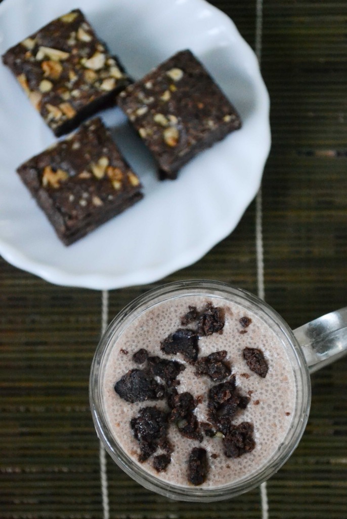 Во сад за матење, ставете ја смесата со кафето, смесата со млекото и парчињата брауни. Матете додека не добиете мека и мазна мешавина. Сипете во чаша за послужување и декорирајте со трошки од брауни.