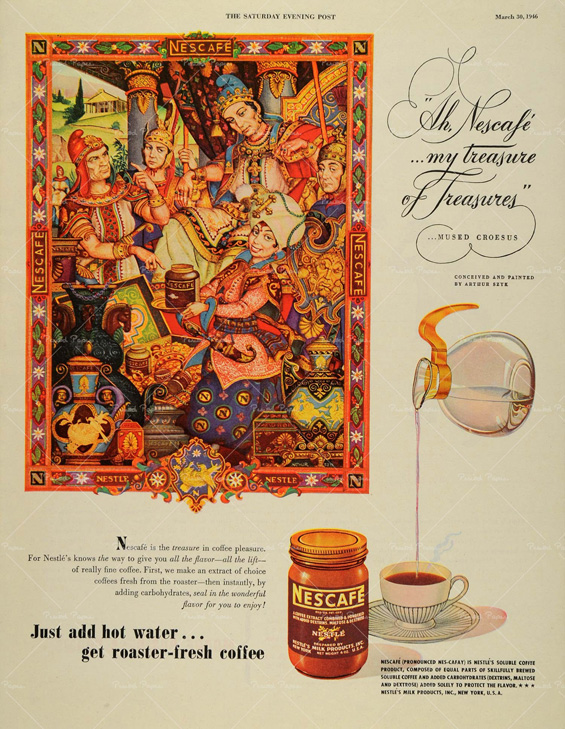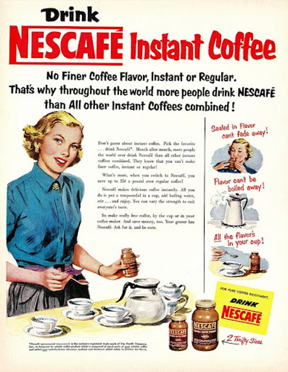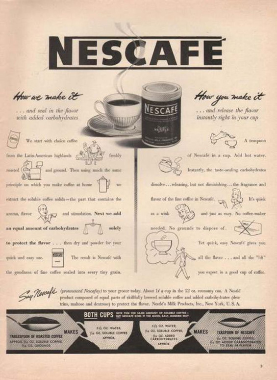 Нема реклама за инстант кафе која претставува приказ на реализам или вистина. Затоа што нема таква реклама која ќе каже дека нејзиниот производ има вкус на нечистотија. Но, огласувачите на инстант кафето низ историјата, навистина ја наметнаа „вистината“, кога почнаа да тврдат дека нивниот инстант напиток е подобар од вистинското кафе.