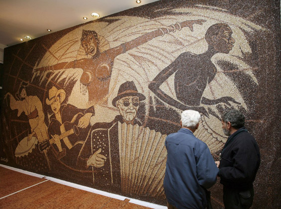 Најголемиот мозаик изработен од зрна кафе, според Гинис, е мозаикот на албанскиот уметник Саимир Страти. Тој содржи 140 кг кафе во зрна и претставува групен портрет на африкански тапанар, бразилска танчерка, европски хармоникаш, јапонски тапанар и американски кантри-пејач.