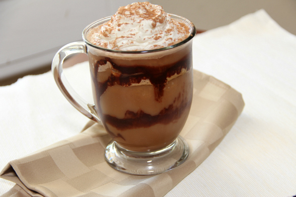 Додадете ги сите состојки во блендер, освен оние за декорација. Мешајте сѐ додека не добиете мазна површина. Декорирајте ја чашата со чоколаден сируп, сипете ја кафе-мешавината во неа и потоа на врвот додадете шлаг пена и прстофат какао. Уживајте.