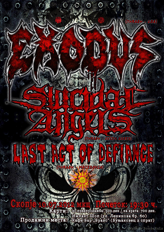 Како концертна поддршка ќе настапат и грчките треш-металци Suicidal Angels, како и скопскиот кросовер-треш метал бенд Last Act of Defiance!!!