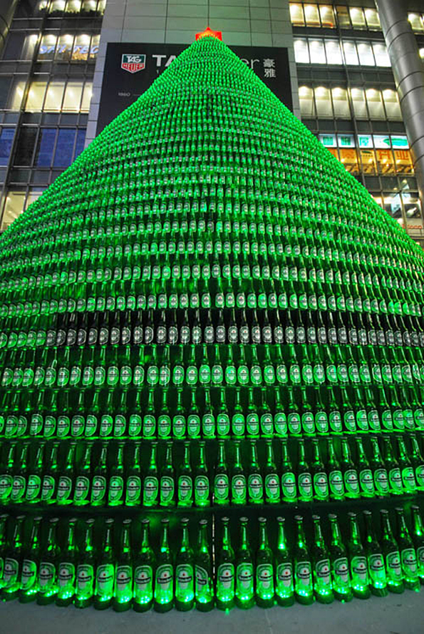 Компанијата Хајнекен отсекогаш изнаоѓала мудар начин да го рекламира својот производ со шишињата за пиво. Во 60-тите години дури размислувала да ги редизајнира шишињата за да можат да послужат како тули. Пред неколку години во Шангај, компанијата решила да употреби 1.000 шишиња за да креира интересна новогодишна елка.