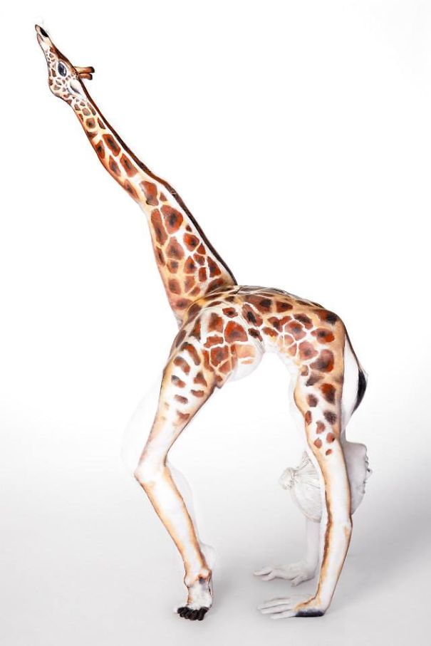 Доколку мислите дека на фотографијата гледате жирафа, погледнете подобро. Се работи за маестрална оптичка илузија изработена од мејкап и концепт артистката Ема Феј, која го обоила моделот Бет Скајс како грациозна жирафа. Прекрасно, нели!?