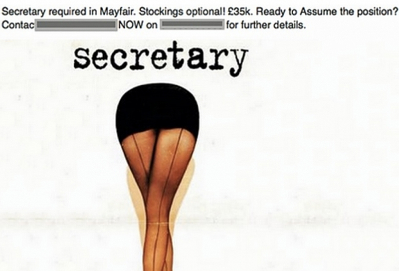Наведнатата жена во кусо здолниште и тенки црни хулахопки не е соодветна илустрација за позицијата на секретарка. Уште кога на тоа ќе се додаде текстот: „Потребна е секретарка во Мејфер. Хулахопки не се задолжителни. Подготвени ли сте да ја заземете позицијата?“, добивате страшно омаловажувачка сексистичка порака.